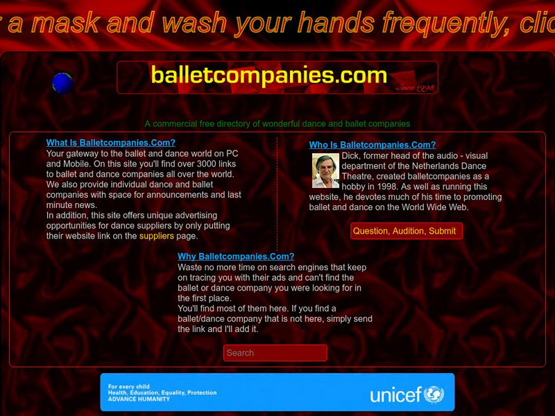 Links to every ballet and dance company in the world. Pick a country and find the company you're looking for. Then check to learn more about their programs, schedules, and dancers.