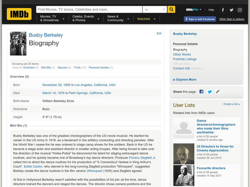 From the US Army conducting and directing parades to smashing success on Broadway, Busby Berkeley was one of the greatest choreographers in the U.S. Read his brief biography and get a large list of his many works.