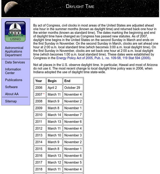 From the U.S. Naval Observatory, a brief history of daylight savings time including information of the passage of the Energy Policy Act of 2005 which changed the date from the first Sunday in April to the second Sunday in March starting...