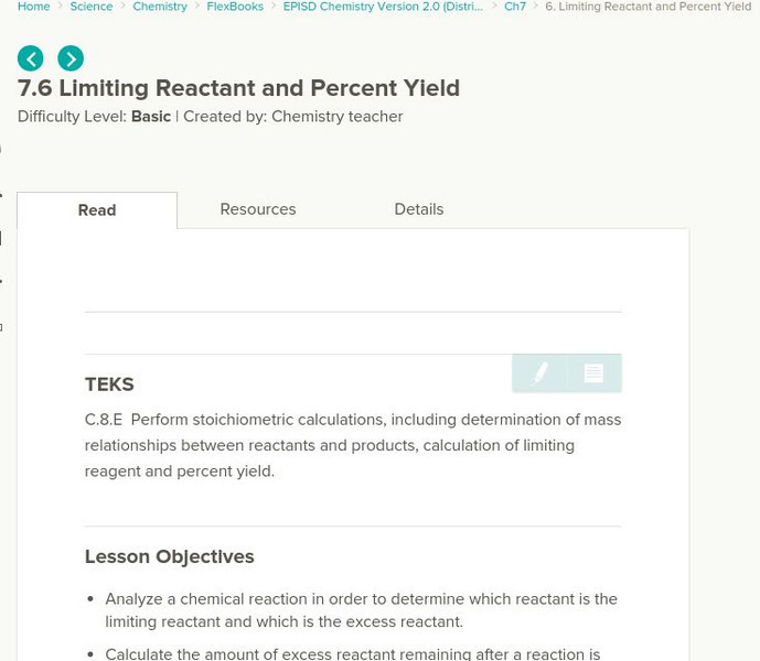 Ck 12: Limiting Reactant and Percent Yield