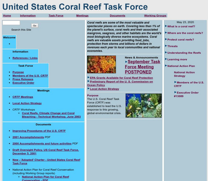 The US Coral Reef Task Force was created to protect and sustain US coral reefs. This website provides general coral reef information as well as updates from the most recent task force meetings.