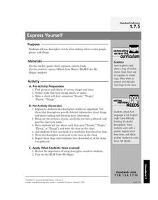 First graders identify details that make reading and writing more interesting. They classify events, people, places, and things and attach specific characteristics to each one. Everyone generates describing words on a worksheet that's...