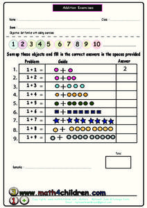In this early childhood addition practice worksheet, students use their problem solving skills to solve 8 problems that require them to add 1 and 2 digit numbers.