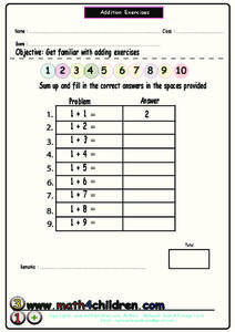 In this early childhood addition practice learning exercise, students find the sum in 42 addition problems which require them to add 1 digit numbers to 1 digit numbers.