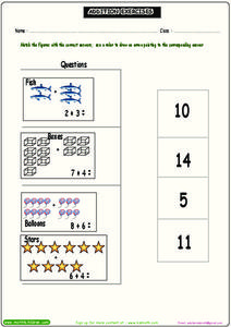 For this early childhood math worksheet, students practice their addition skills as they solve 3 addition problems by using the counters pictured on the sheet. Students then match their answers to the 3 numerals in the right-hand column.