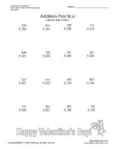 In this addition practice worksheet, students solve a total of 16 addition problems, all problems add one 3 digit number to another 3 digit number.