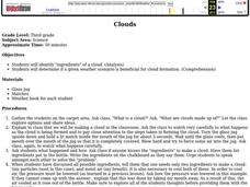 Young scholars analyze how clouds form. In this cloud formation lesson, young scholars brainstorm types of clouds and what they think they're made of. Young scholars conduct an experiment to see how clouds form and discuss their...
