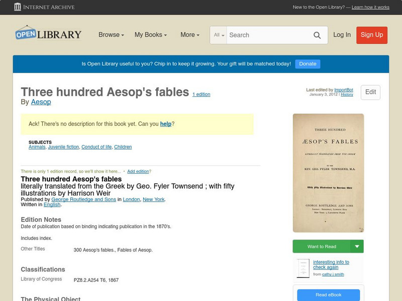 This ebook version of Aesop's Three Hundred Aesop's Fables has been made available in multiple formats by the Open Library. Editions of the full novel, organized by year of publication, may be accessed here.