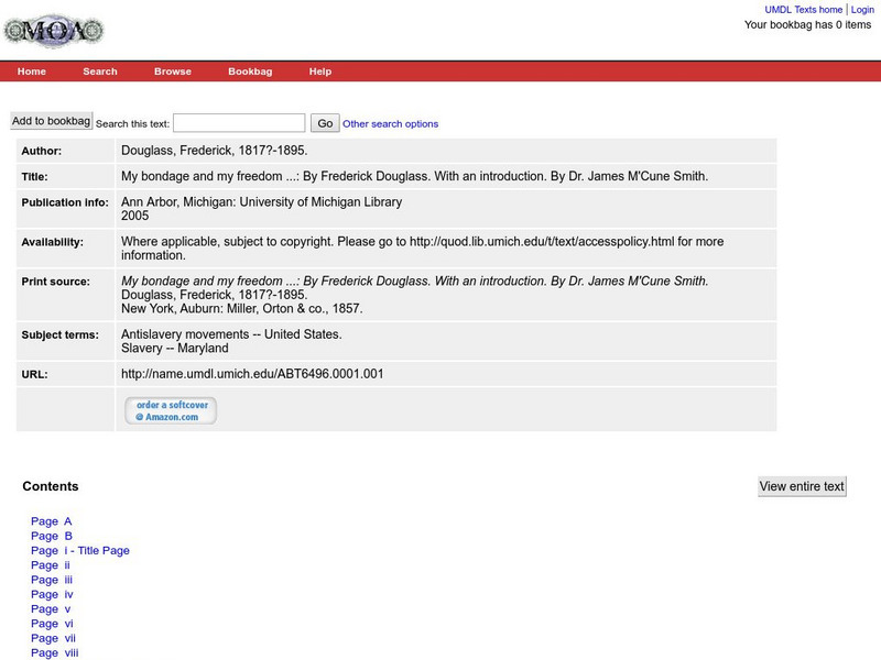 The complete online text of "My Bondage and My Freedom" by Frederick Douglass is available through University of Michigan Digital Library Text Collections.