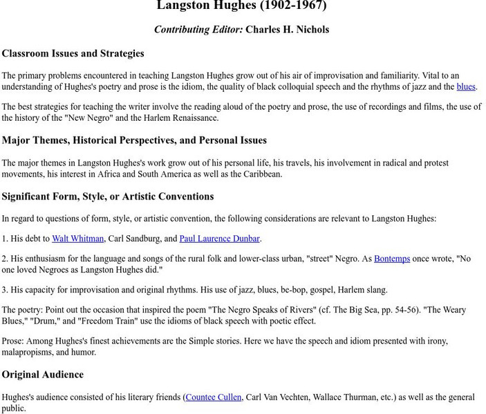 Excellent research site on Langston Hughes. Includes theme, perspective, form, style, audience, comparison and contrast of the famous Harlem Renaissance author's work.