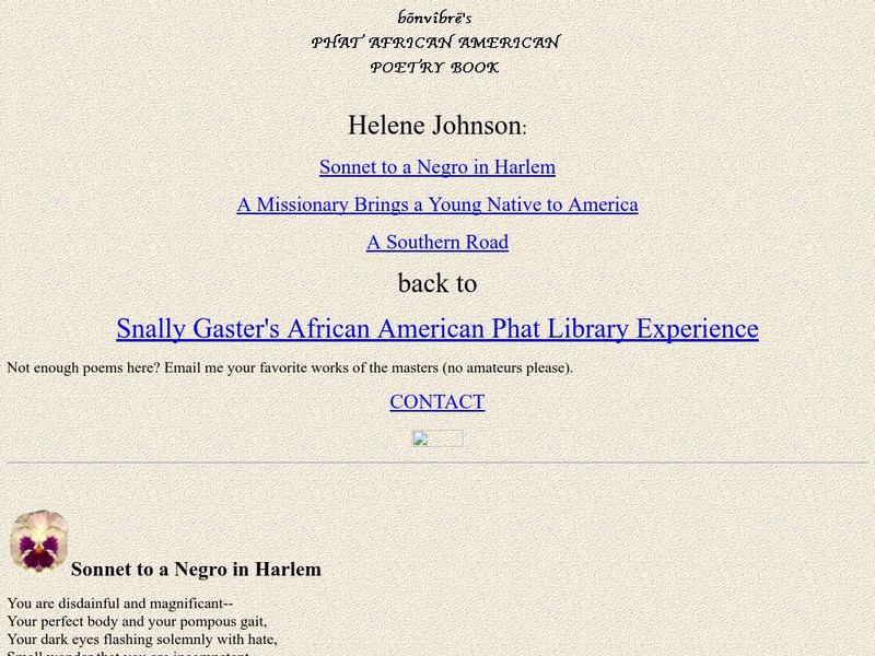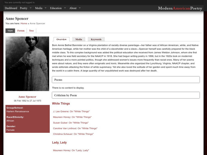 In-depth site on Anne Spencer including an extensive biography of this famous Harlem Renaissance poet. Detailed information on her works, education, and contemporaries. Numerous photographs. Some of her poems are also included.