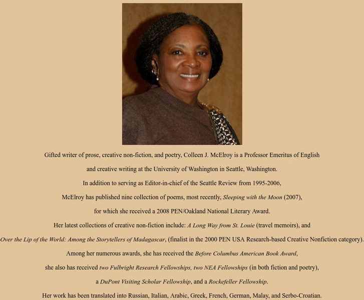 This site is from the University of Washington, where McElroy is a professor. It has biographical information, a list of her works, and other details about the writer.