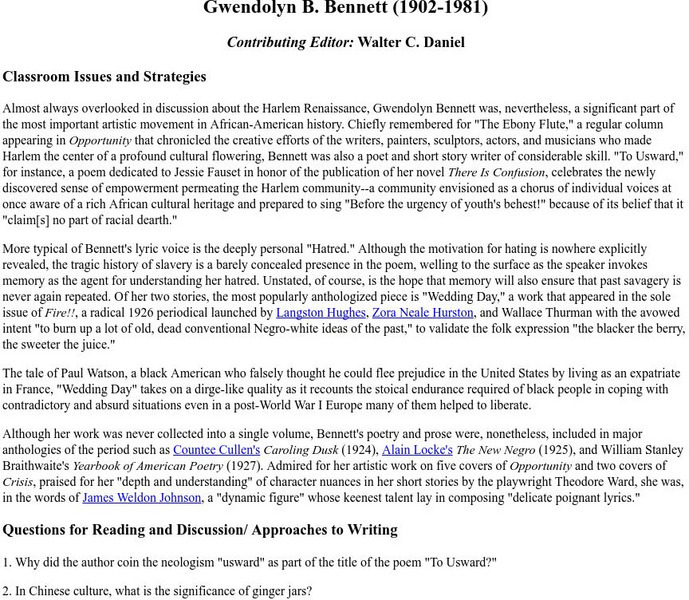 Includes theme, perspective, form, style and comparison of Anne Spencer's work. Many contemporaries are named and linked.