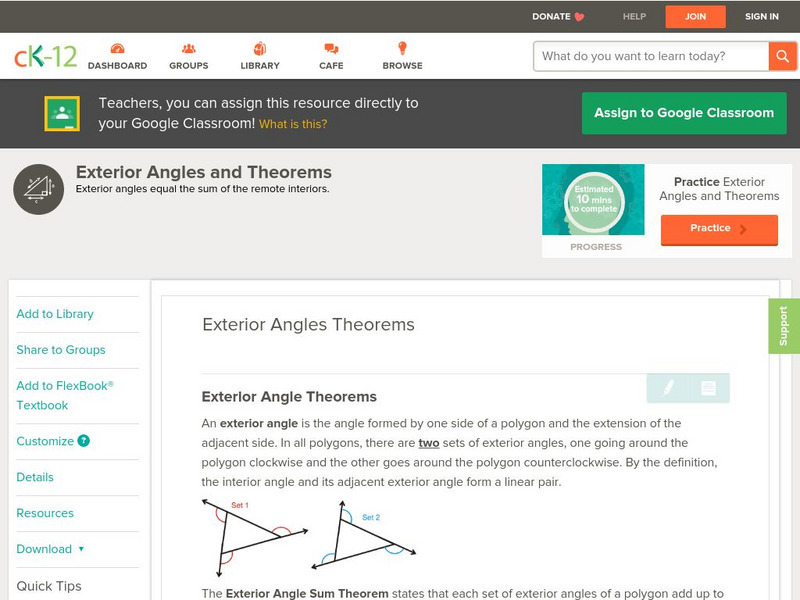 [Free Registration/Login may be required to access all resource tools.] This concept teaches students the sum of exterior angles for any polygon and the relationship between exterior angles and remote interior angles in a triangle....