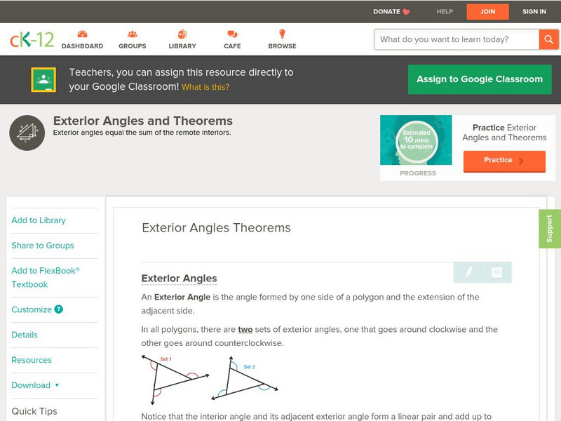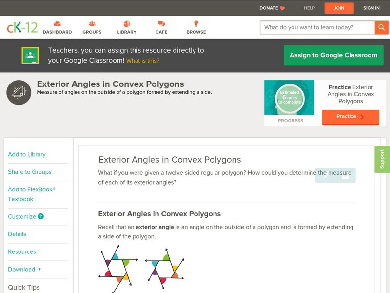 [Free Registration/Login may be required to access all resource tools.] This concept teaches students how to calculate exterior angles of regular polygons. Students examine guided notes, review guided practice, watch instructional videos...