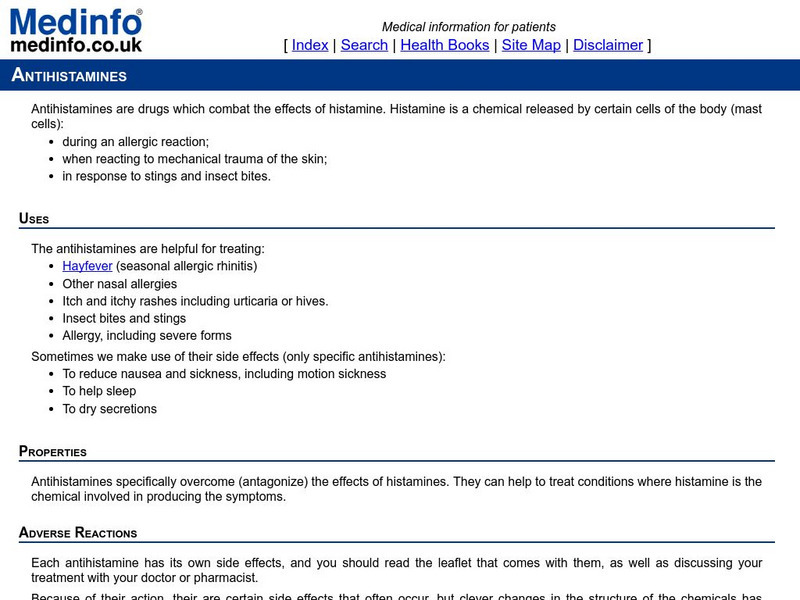 A description of antihistamines which tells what they're used for, the different forms they come in, and the adverse reactions that can occur from taking them.