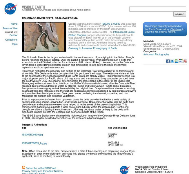 A satellite image from NASA of the Colorado River Delta, located in Northern Mexico. Follow the links for more detailed images.