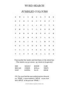 In this Jumbled Colours Word Search worksheet, students unscramble 12 colors and then find them in the word search. For example, DER is unscrambled to RED.