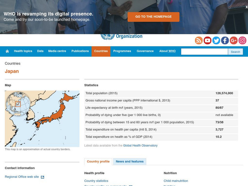 Learn about core health indicators in Japan in this World Health Organization country profile, which includes demographic and health information both historic and current. The 'News and features' tab includes articles.