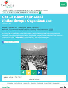 Young scholars develop appropriate interview questions, interview a philanthropic organization, and present information to the class. They use pamphlets and/or other materials gained during their interviews to mount a display about the...