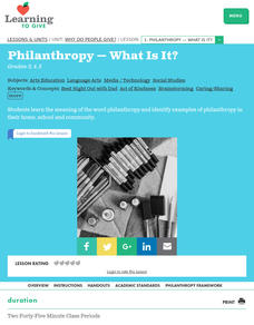Students explore the concept of philanthropy. In this service learning lesson, students collaborate to determine the success of a service learning project that their class completed.