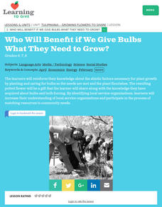 Students identify the elements needed for bulbs to grow. They raise tulips and give them to various members of the community. They identify local philanthropic communities and look for ways they can constructively donate time and give...