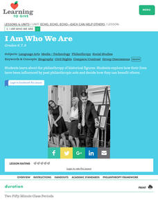 Students explore the meaning of the term "philanthropy" and the qualities that philanthropists share, especially good character and personal virtue. They list and describe how three volunteer groups act for the common good and summarize...