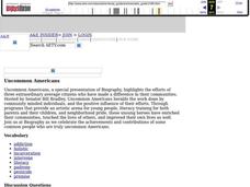 Students view a documentary called, Uncommon Americans, a special presentation of Biography, highlights the efforts of three extraordinary average citizens who have made a difference in their communities. Discussion and a creative...