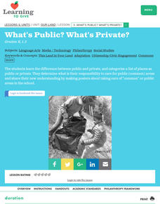 Young scholars explore the difference between public and private, and will categorize a list of places as public or private. They determine what is their responsibility to care for public (common) areas and share their new understanding...