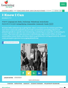 Students explore the concept of philanthropy, and identify specific philanthropic agencies in their community. They participate in philanthropic opportunities, and develop persuasive arguments to encourage others to give of their own...