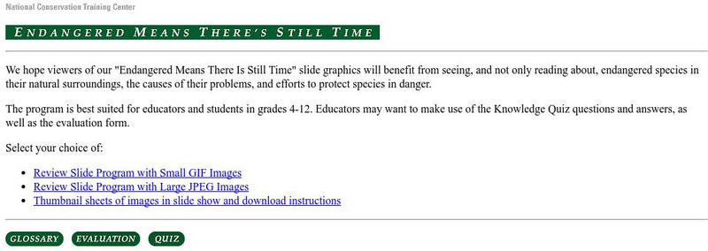 This site contains a slide presentation of endangered species. At the bottom of the page are links to a glossary and quiz questions.