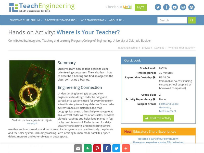 In this activity, students will learn how to take bearing with a compass. They will also learn how to describe a bearing and find an object in their classroom using a bearing.