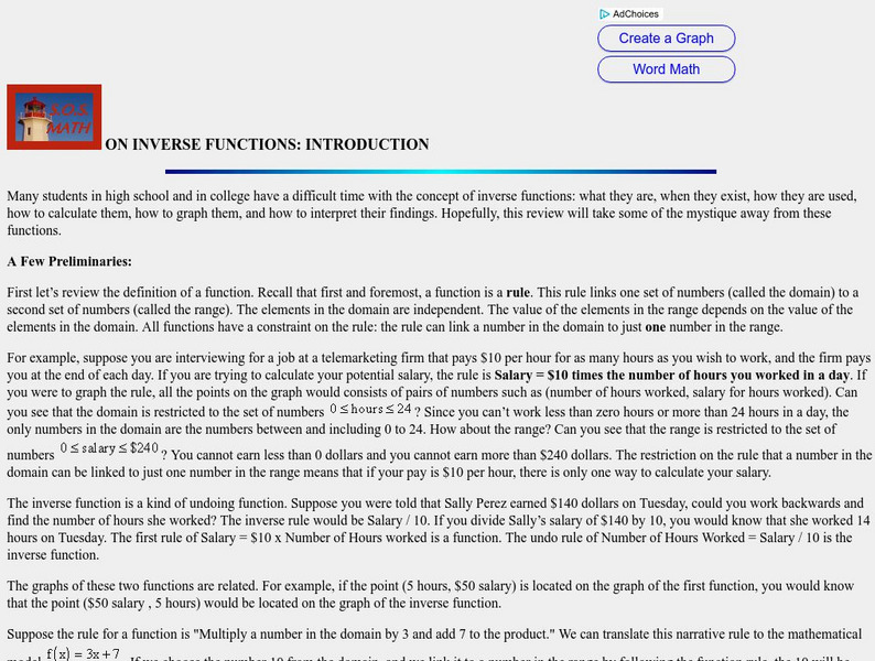 This tutorial contains four lessons on inverse functions (on five pages) including an introduction, inverse functions with no domain restriction, composition of functions, and inverse functions with domain restriction. Includes practice...