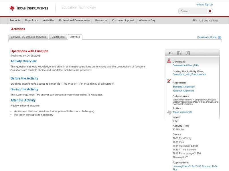 This question set tests knowledge and skills in arithmetic operations on functions and the composition of functions. Questions are multiple choice and true/false; solutions are provided.