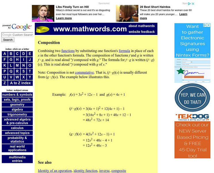 Provides examples and a video lesson that illustrate the composition of functions. [1:44]