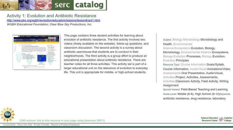 This page contains three student activities for learning about evolution of antibiotic resistance. The first activity involves two videos (freely available on the website), follow-up questions, and classroom discussion. The second...