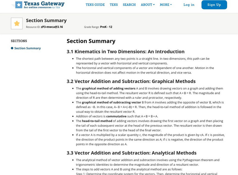 Texas Gateway: Kinematics in Two Dimensions: Section Summary