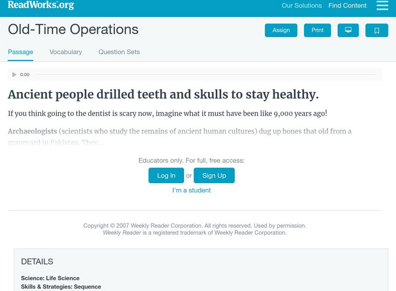 [Free Registration/Login Required] An informational text and timeline about ancient dentistry and surgeries. A question sheet is available to help students build skills in reading comprehension.
