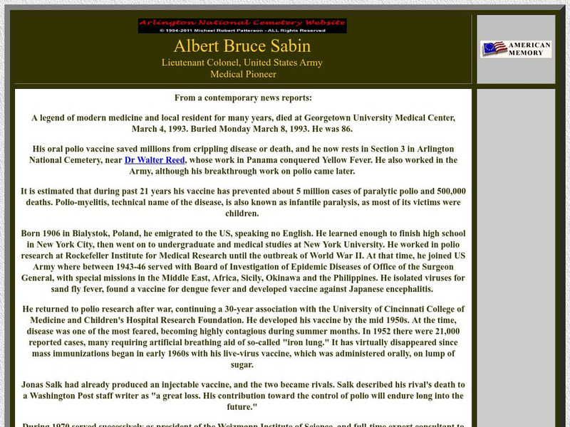 This site from the Arlington National Cemetery contains a brief biography of Dr. Sabin, mentioning some little known facts about his life. Includes several pictures of the gravesite as well as links to additional information.