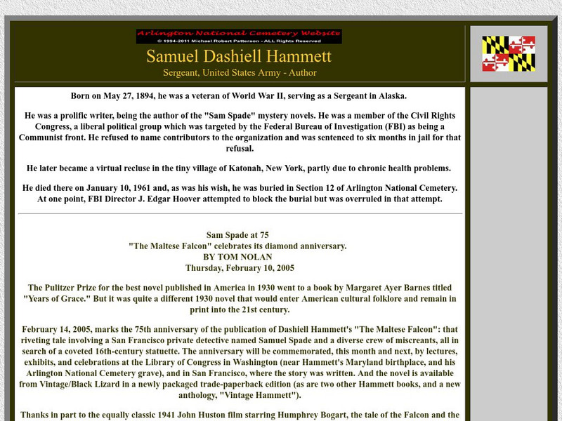 This site from the Arlington National Cemetery has information about Dashiell Hammett and his service as a sergeant in the Army. Includes great biographical information along with several helpful pictures of this sergeant and author.