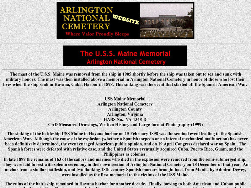 This site from the Arlington National Cemetery contains a memorial to the U.S.S. Maine, a ship that was sunk during the Spanish-American War. Includes some brief text, then a lot of pictures, and then some in-depth text.