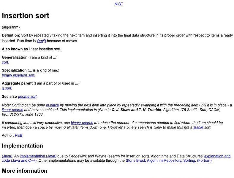 Provides a clear definition of an insertion sort with links to a Java implementation and other demonstrations.