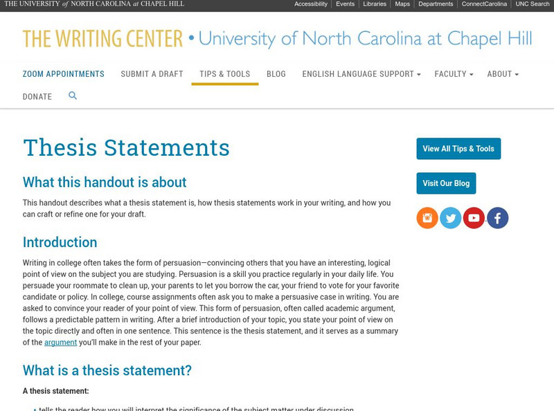 The Indiana University of Pennsylvania Writing Center article provides information about the "thesis" of a paper. Examples of clear thesis statements are also provided.
