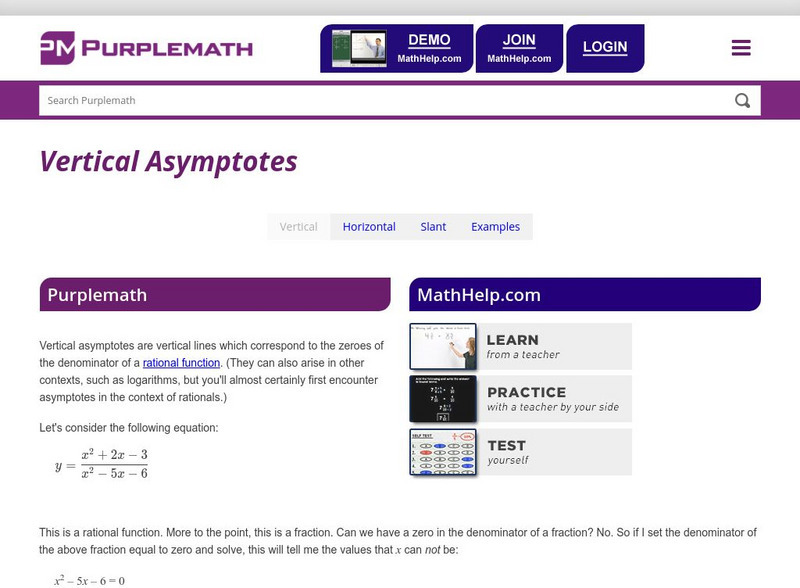This Purple Math lesson provides an explanation and examples on vertical asymptotes.