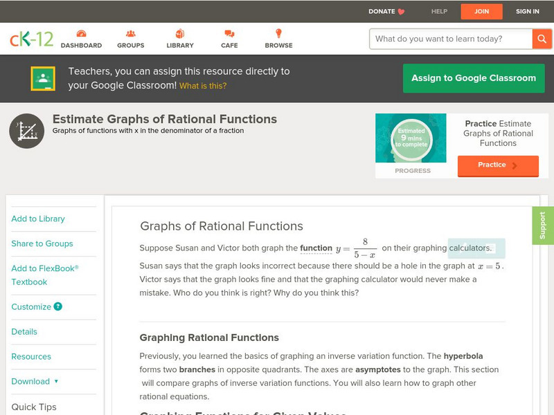 [Free Registration/Login may be required to access all resource tools.] Learn about the shapes and characteristics of graphs of rational functions. Students examine guided notes, review guided practice, watch instructional videos and...