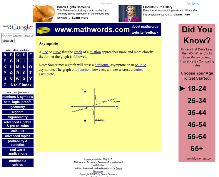 This site from MathWorld provides a picture, or diagram of the asymptotes along with a very brief, one sentence definition. Links are provided for related subjects, along with a short bibliography.