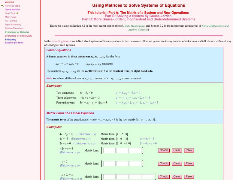 The tutorial examines the matrix of a system and row operations. Students learn about the concepts through class notes, examples, and practice problems. Topics include a system of linear equations and augmented matrices. Review exercises...