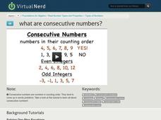 The instructor writes an example of integers in consecutive order, or counting order, and also an example of integers not in consecutive order. She then shows two special types of consecutives number patterns.