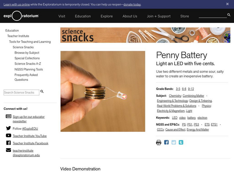 In this experiment, students will learn how to make a battery with a water solution and two types of metal. This is then used to power an LED light. Includes video demonstration.