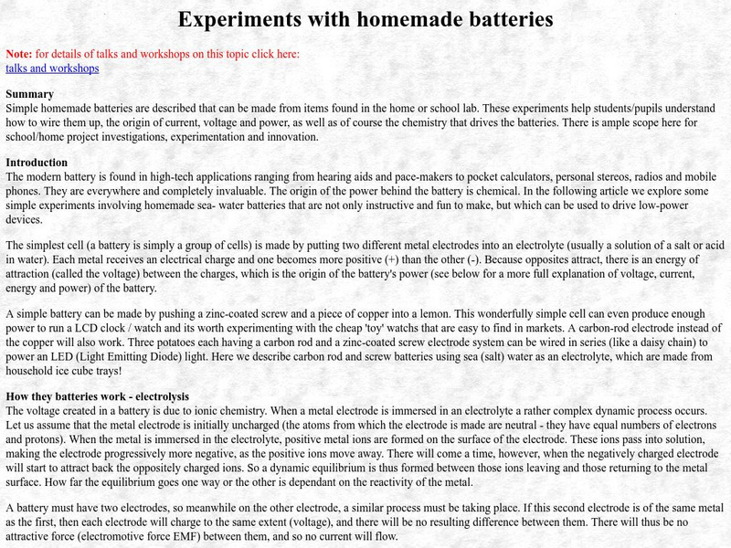 Simple homemade batteries are described that can be made from items found in the home or school lab. These experiments help students understand how to wire them up, the origin of current, voltage and power, as well as the chemistry that...